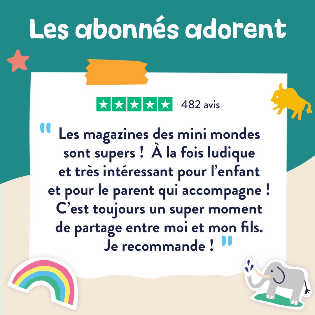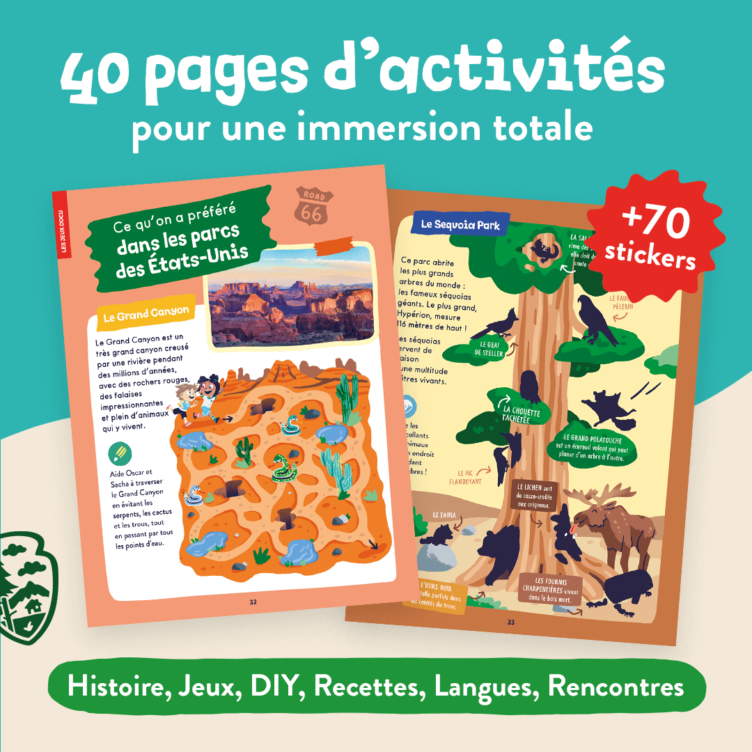 Un magazine pour enfants de 40 pages, adapté à leur âge, avec : des incroyables histoires, des jeux, des initiations linguistiques, des coloriages, un DIY, plein de gommettes (+ de 66 stickers!)…